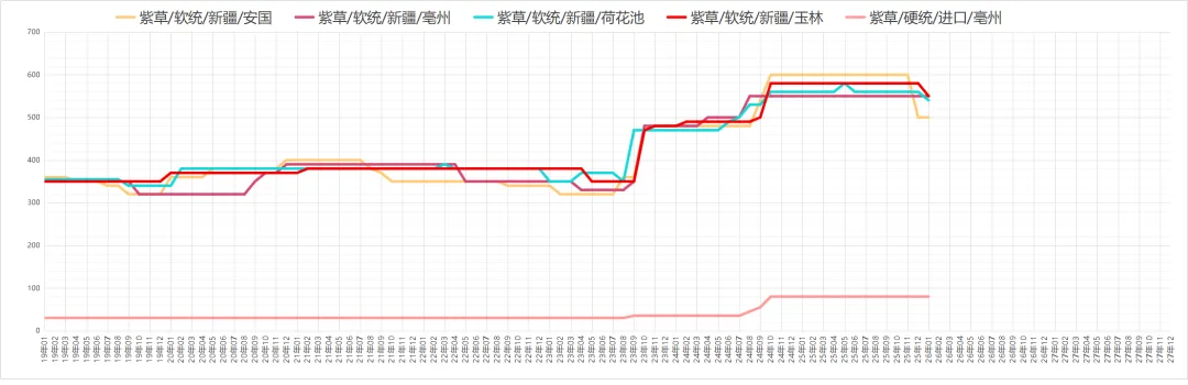 紫草近期有商寻货,紫草尚有库存待售,近期有商寻货,货源走销多以按需采购为主,价格较前期有小幅下降,现新疆软统货价格在480元左右。