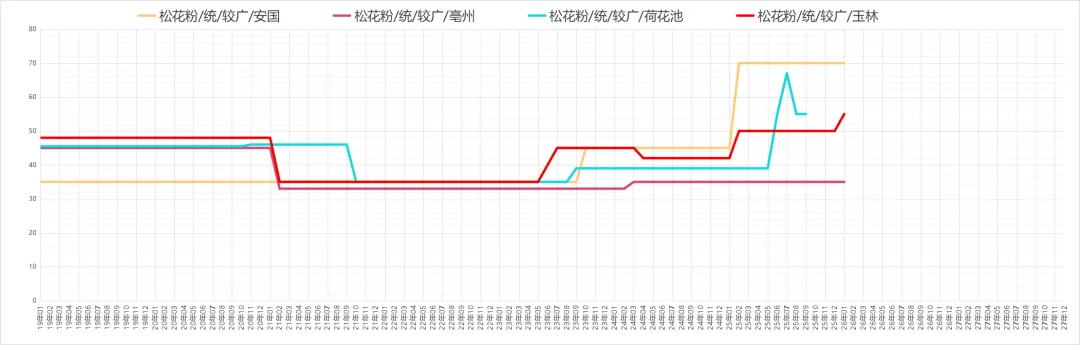松花粉价格平稳,松花粉近期有商寻货,货源走销多以按需采购为主,价格较前期保持平稳,现东北统货价格在65-70元。