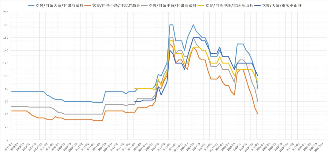 今日新货党参药厂0.4cm以下成交价格在40-44元/kg(大部分全干),规格0.4-0.6的小条价格46-52元/kg(9成干),规格0.6-0.8cm成交价格53-62元/kg(8成干);0.8-1.0的成交价格66-82元/kg之间(8成干);1.0cm以上的成交价的86元/kg以上(7-8成干)。以上价格仅供参考,具体以实际成交价格为主。