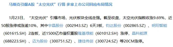 3、马斯克的商业航天炒作在A股炒作了接近2个月,不知道这个太空光伏能否接力商业航天,再来个跨春节的行情,如果能再来一波,那么光伏相关翻个1-5倍很轻松。大家可以都加自选观察一下,看看后面的炒作力度。