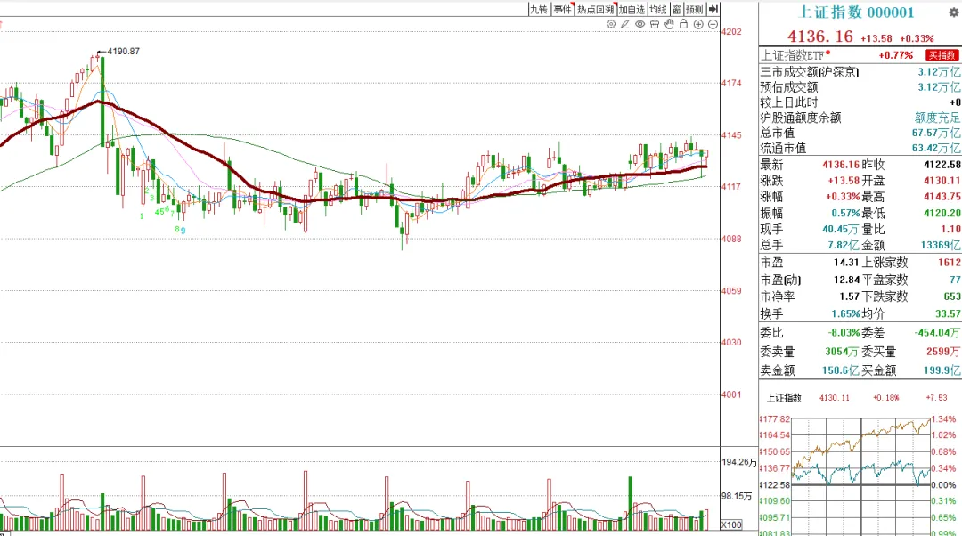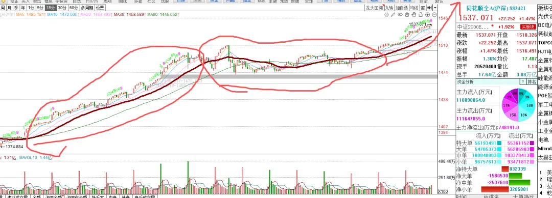 从同花顺全A指数的15分钟K线来看,上涨趋势应该还未结束,如图,经过一波上涨以及横盘调整后,趋势明显选择了向上,那么这波拉升的长度,不应该比上一波短太多。目前看,这才刚刚开始上涨。这种强势状态下,就看同花顺全A指数的10均线,只要不跌破10均线,我认为,就是可以看涨的,如果跌破就要注意风险。下周一可以以10均线作为强弱分界线,跌破坚决清仓,不跌破可以等一等。