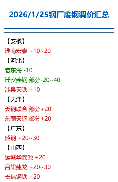 2026年1月25日6时起,吕梁建龙所收废钢上调20元/吨、小料上调30元/吨。剪切料1830,冲压料2360,钢筋头2360,废旧道轨2340,废旧火车轮2340,优质废钢2340,重废特级2300,重废一级2260,重废二级2240,重废三级2220,中废2110,钢板边角料一级2270,钢板边角料二级2210,一级2260,二级2210,钢筋压块停收,汽车前后桥2280 25日唐山燕钢最新价:重型(1)2450,优质2430,重型(2)2430,重型A2410,重型B2310,中型A2370,中型B2270,优质铸铁2290,普通铸铁2090,大件剪切2380,炉料1:2290,炉料2:2240,压块2170,散片2260,一级剪切料2220,二级剪切料2200,三级剪切料2140,四级剪切料2030,彩钢瓦散片2030,车架子剪切、汽车座椅2200,汽车楼子剪切2110,北京码边料1950,民用采暖炉2200 山西华鑫源1月25日9时起,废钢上调20:钢筋颗粒2270特级重废2250优质重废2230重废一级2170重废二级2120重废三级2090钢筋压块2170中废(4-6mm)1950 中首通知:破碎原料车间架子管停收。开收时间另行通知!1.5米以下架子管炉料车间正常收货。 1月25日起,韶钢废钢上调20-30元/吨。具体价格以厂家价格表为准 山西长信通知:从2026年1月25号0时废钢统一上调20元/吨,废钢车辆下午五点半之前进厂,两公里外必须把水箱水放干净。 钢板毛料2250-2280,筋团毛料2230-2250,道轨毛料2200-2250,毛料2030-2190,机械生铁2210,剪切料2110,统料2200,混料2250,一级料2280,准一级料2300,重废2320,优质料2350-2370 老东海25日起所有料型下调10元。 老东海25日起所有料型下调10元,价格参考:优质A≥15mm2470,优质B≥12mm2450,优质C≥10mm2420,重A≥8mm2390,重B≥6mm2350,重C≥4mm2310,重D≥3mm2250,矽钢片瓜子料2370,矽钢片三角片2370,冷热轧小料2-4厚2390,冷热轧小料1-2厚2350,08铝小料2310,6厚生熟混装2350,8厚生熟混装2390,机体钢件干磨2390,无缝管头2390,6-10工地料2390,5-8工地料2350,2-5工地料2280,桥梁大模板短尺2390,8厚以上塔吊2390,6厚以上塔吊2350,1厚马蹄铁2350,1.5厚马铁蹄2370,2-4厚马蹄铁2390,小车弓子板2390,特级破碎料2390,特一级破碎2370,一级破碎料2310,管子扁切片2390,干磨梅花冲2390,压缩机壳干磨2310,小车钢圈2310,架子管头2310,家具方管2250 25日淮南宏泰废钢涨10~20:钢筋切粒2350,优重2250,重废2190,中废2100-2140,冷热轧压块2140,生铁焦钢2180,小废停收,刨花2000-2100,冲子2180 涉县天铁25日价格上调,具体价格以厂家价格表为准 涉县天铁1月25日零时价格:重废4mm2245,重废8mm2290,重废14mm2318,精重5mm2327,精重9mm2354,精品重废5mm2290,精品重废9mm2336,精品重废14mm2345,钢筋段500mm2290,钢筋压块2327,精重1.8mm2254 兰州兰鑫钢铁集团,1月24日18:00重废、剪料价格下调20元/吨 24日兰鑫高炉厂废钢跌20:钢筋切头2170,特级料2170,重废14厚2140,10厚2110,8厚2080,6厚2050,4厚2020,机件生铁2040,前后桥2110,钢筋压块停收 天钢联合1月25日开始执行,钢筋压块2362,花铁压块2362,边丝压块2308,打包带压块2308,钢筋切头2443,冲豆停收 25日东丽天钢最新价:钢筋压块2362,花铁压块2344,扁丝压块2308,重废6mm2344,重废8mm2371,重废10mm2398,具体价格以厂家价格表为准 |