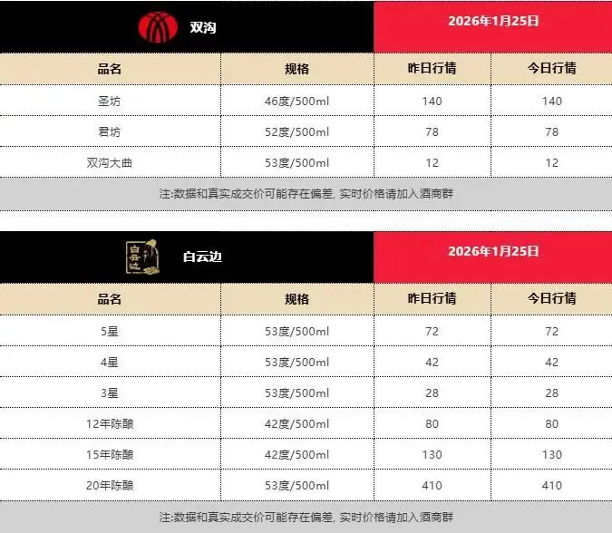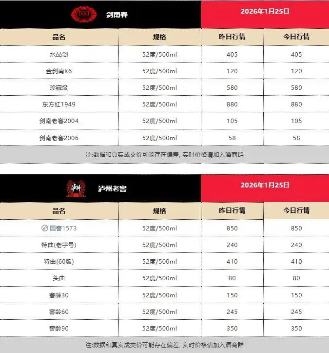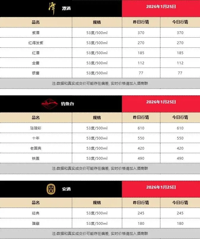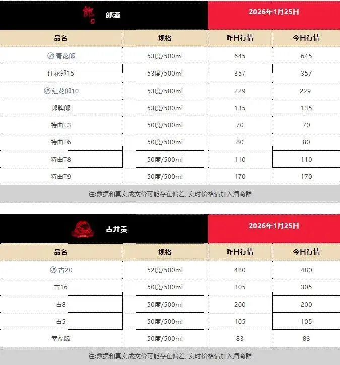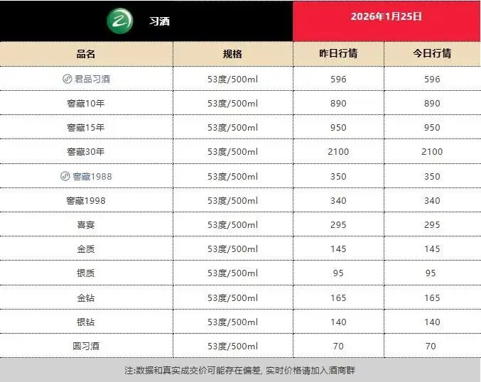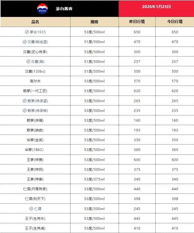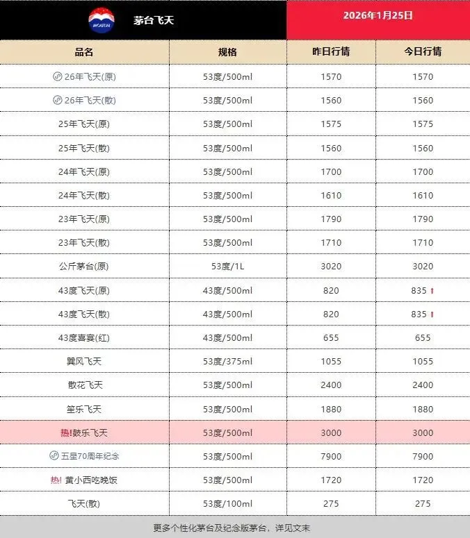 结合最新市场动态,2026年1月25日飞天茅台批发价格与前一日持平,但有个别产品出现小幅上涨。43度飞天茅台(原箱/散瓶):价格从820元上涨至835元,茅台陈年酒:十五年陈从4000元涨至4080元;三十年陈从11800元大幅上涨至12500元。洋河系列:M3(水晶版)从345元涨至365元;52度海之蓝从125元微涨至127元。五粮液旗下的尖庄(荣光)从55元降至50元;杜康的9窖区(新)从110元降至100元。