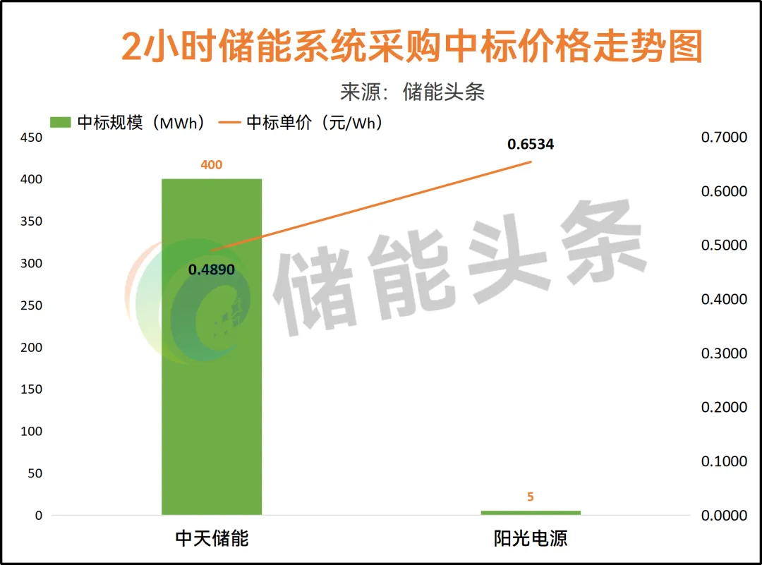最低价由中天储能科技有限公司在启赫新能源河南宝丰200MW/400MWh储能电站项目EPC总承包储能系统设备采购中报出, 单价0.489元/Wh。
