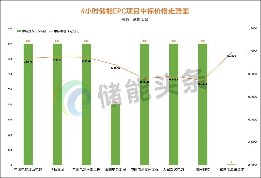 最低价由宁夏水利水电工程局有限公司在灵武马家滩240MW/480MWh储能电站项目EPC总承包中报出, 单价0.58元/Wh。