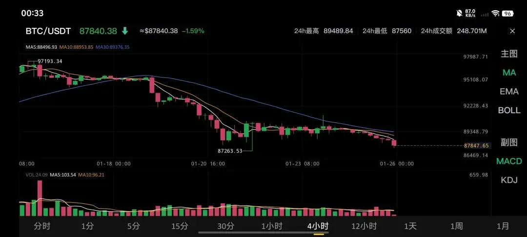 基于当前市场数据(截至北京时间1月26日早盘),比特币价格在87,800-88,000美元区间震荡,24小时跌幅约1.5%-2%,整体呈现弱势整理格局。以下是当日关键分析要点: