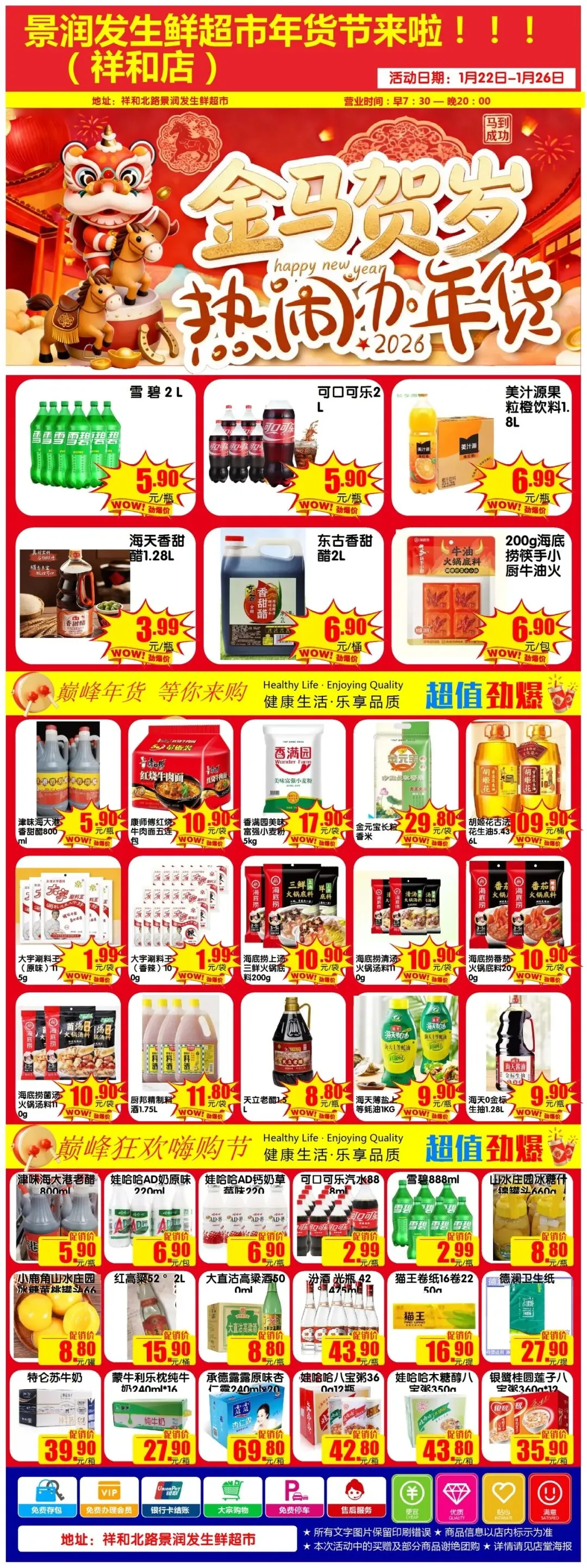 购物满38元送抽纸一包,满68元送海天香甜醋一桶,满88元送金沙河800克挂面一把;(单张小票限一份)(1月22日至26日)