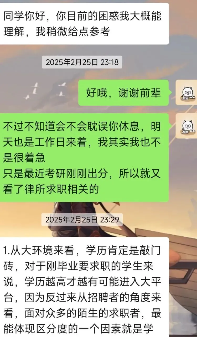2025年我在考研初试以后,当时希望留有一些后路,去很多地方找律所求职信息(具体原因见前文律所求职tips),当时我也有过纠结的时候,询问过很多前辈对于是否要继续深造以及对于律师行业的看法。