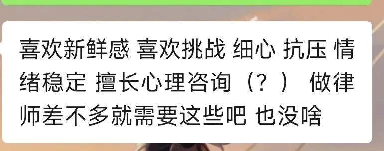 很幸运遇上带教C和我分享了律所的招聘信息,当时想的是“在women in law小组分享的,应该不会氛围很差吧”,她也和我分享了很多自己作为已经入行的人对于律师的看法,当时真的很感动😢,帮我减缓了一些面对未来的焦虑情绪。