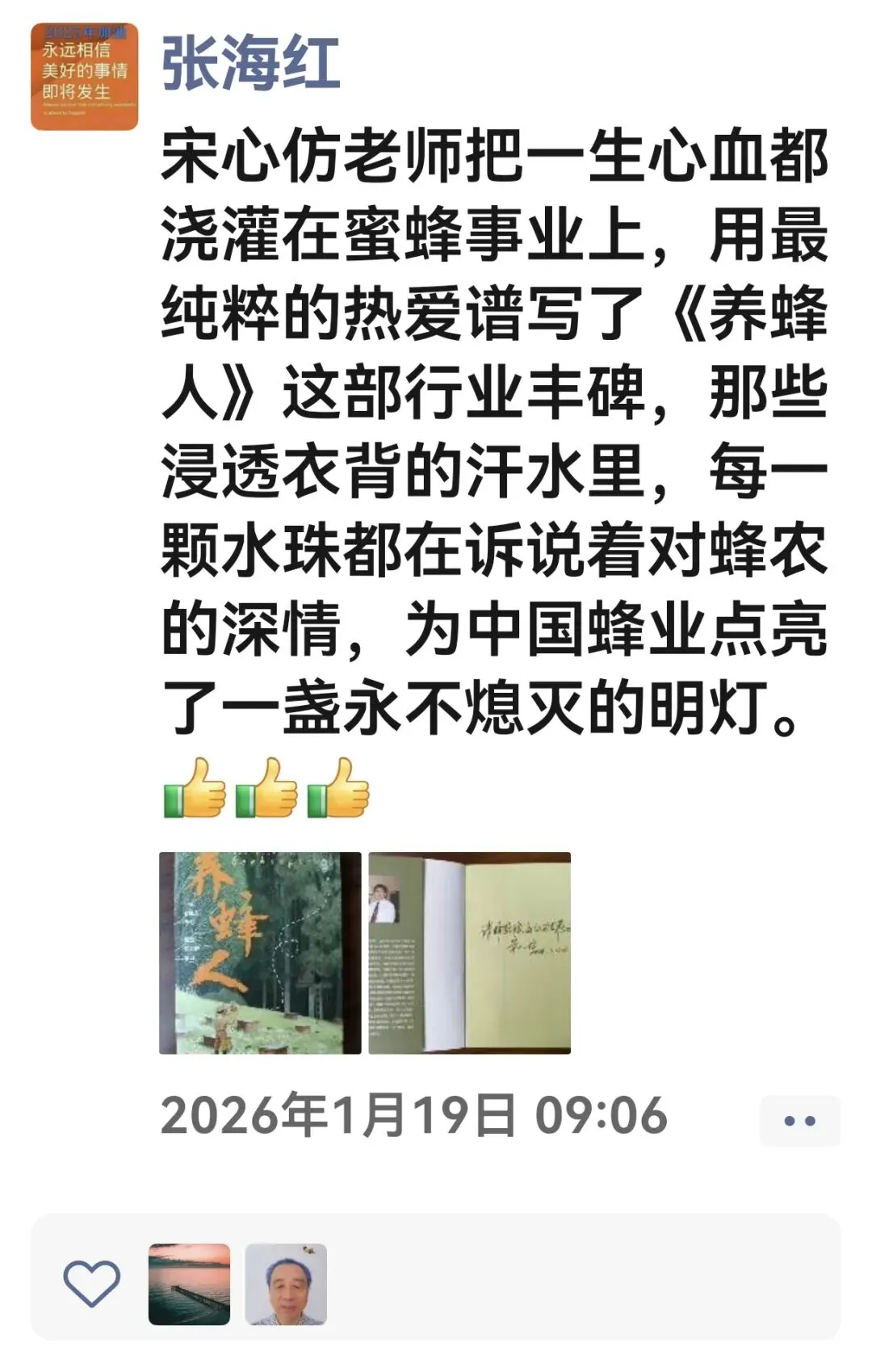 宋心仿老师把一生心血都浇灌在蜜蜂事业上,用最纯粹的热爱谱写了《养蜂人》这部行业丰碑,那些浸透衣背的汗水里,每一颗水珠都在诉说着对蜂农的深情,为中国蜂业点亮了一盏永不熄灭的明灯。
