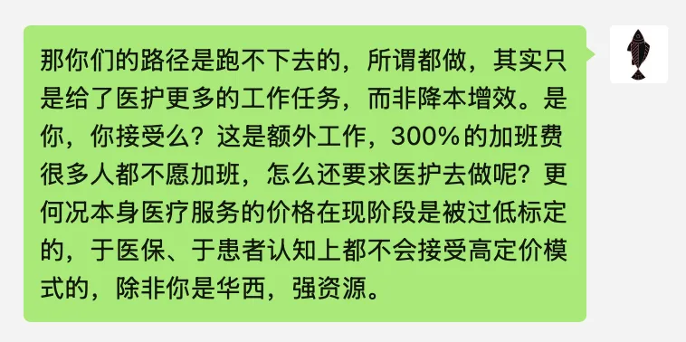 2、患者视角:因为长期以来的医疗服务价格偏低锚定,用户(这个范畴更大,其实大多数是患者)的价值认知与现行价格保持着一致性,在医疗服务资源的独占性稀缺和刚性约束下,没有市场验证环节,就没有供需平衡的调整,所以一切的价格认知标准只有现行价格作为衡量标准,一旦价格高于医保目录中的标定价格,都会被认知为“不划算”。