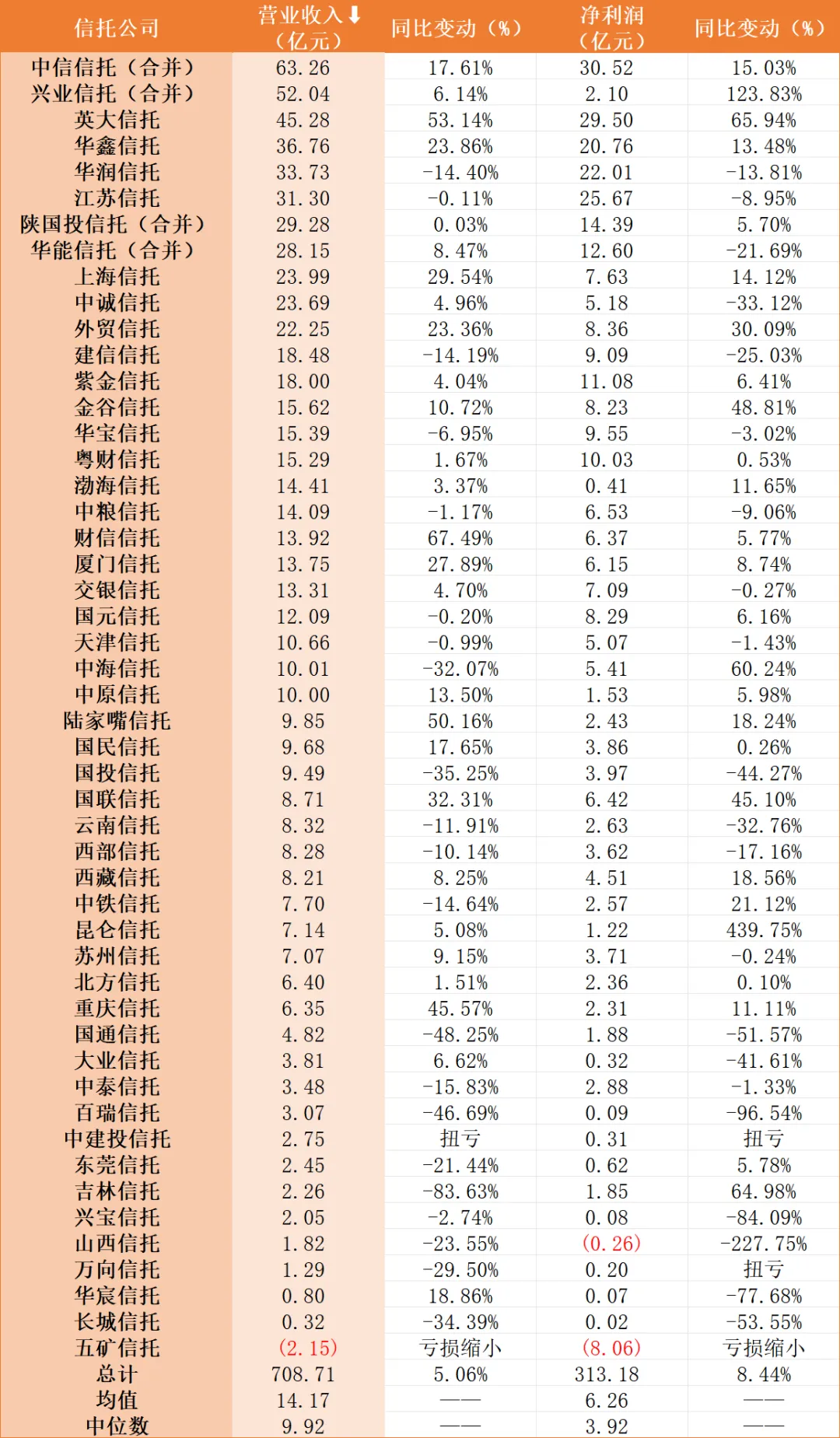 近期,50家信托机构在银行间市场披露了2025年未经审计财报,总营业收入实现708.71亿元,净利润合计实现313.18亿元,同比增速达到5.06%和8.44%。