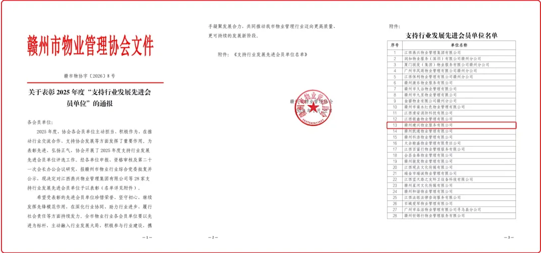 近年来,建兴物业在集团公司及行业主管部门的指导下,获得“赣州市优秀物业服务企业”“赣州市支持文明城市创建企业”“章贡区优秀物业服务企业”“平安章贡建设先进集体”等称号。在管项目获得“文明小区”“文明广场”“文明公园”“美好家园”“物业管理示范项目”等荣誉。
