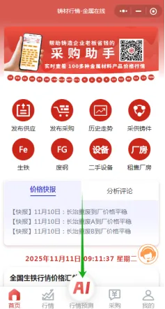 1、长按上方二维码,识别进入【铸材行情】小程序,点击页面下端中间导航栏【AI行情预测】按钮;