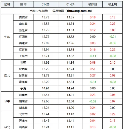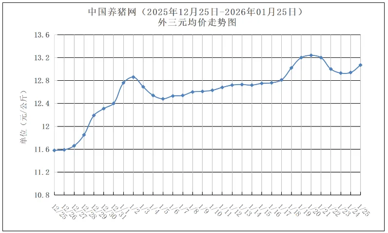 2026年01月25日,中国养猪网猪价系统数据监测如下:生猪(品种:外三元)均价为13.07元/公斤(6.54元/斤),价格较昨日上涨了0.13元/公斤(0.07元/斤);猪价环比上涨12.87%,同比下跌12.87%。