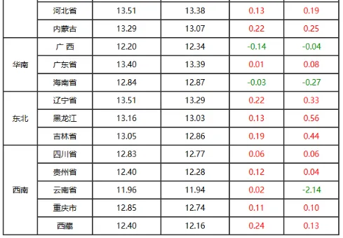 猪价上涨地区(24个):安徽省、河南省、湖北省、天津市、河北省、内蒙古自治区、黑龙江省、四川省、北京市、山东省、藏自治区、浙江省、辽宁省、江苏省、陕西省、甘肃省、山西省、吉林省、福建省、新疆维吾尔自治区、广东省、云南省、贵州省、重庆市;上涨区间:0.01-0.51元/公斤: