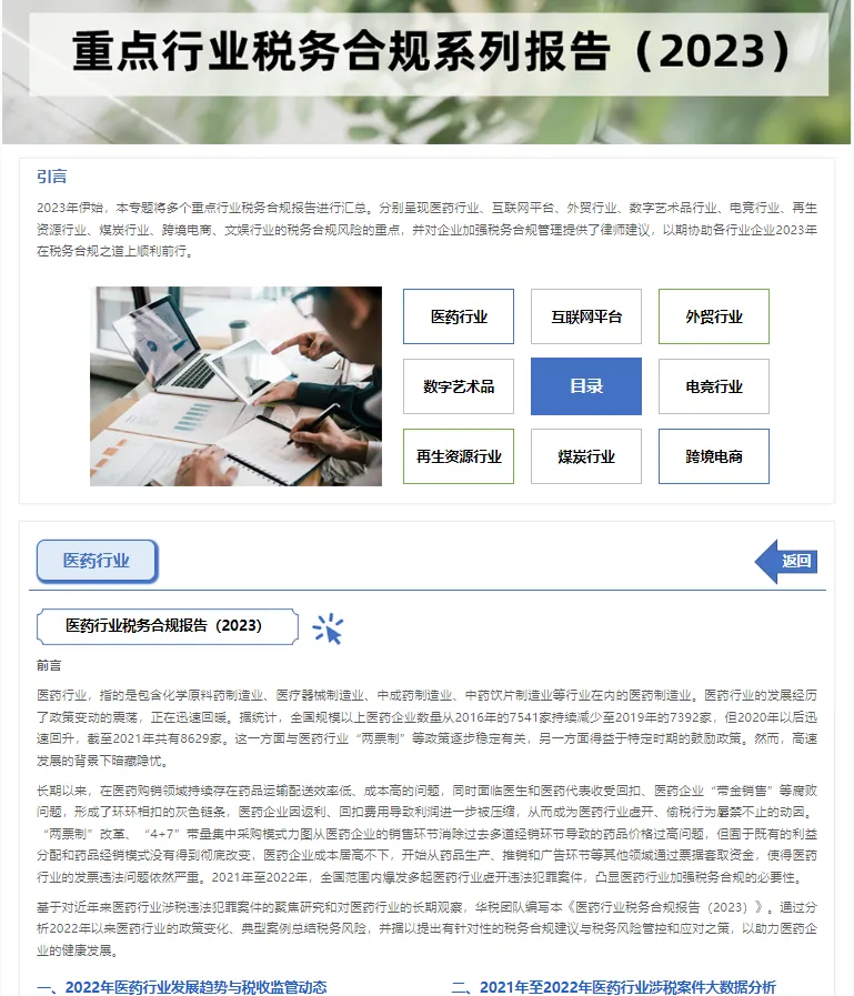 2023年伊始,本专题将多个重点行业税务合规报告进行汇总。分别呈现医药行业、互联网平台、外贸行业、数字艺术品行业、电竞行业、再生资源行业、煤炭行业、跨境电商、文娱行业的税务合规风险的重点,并对企业加强税务合规管理提供了律师建议,以期协助各行业企业2023年在税务合规之道上顺利前行。