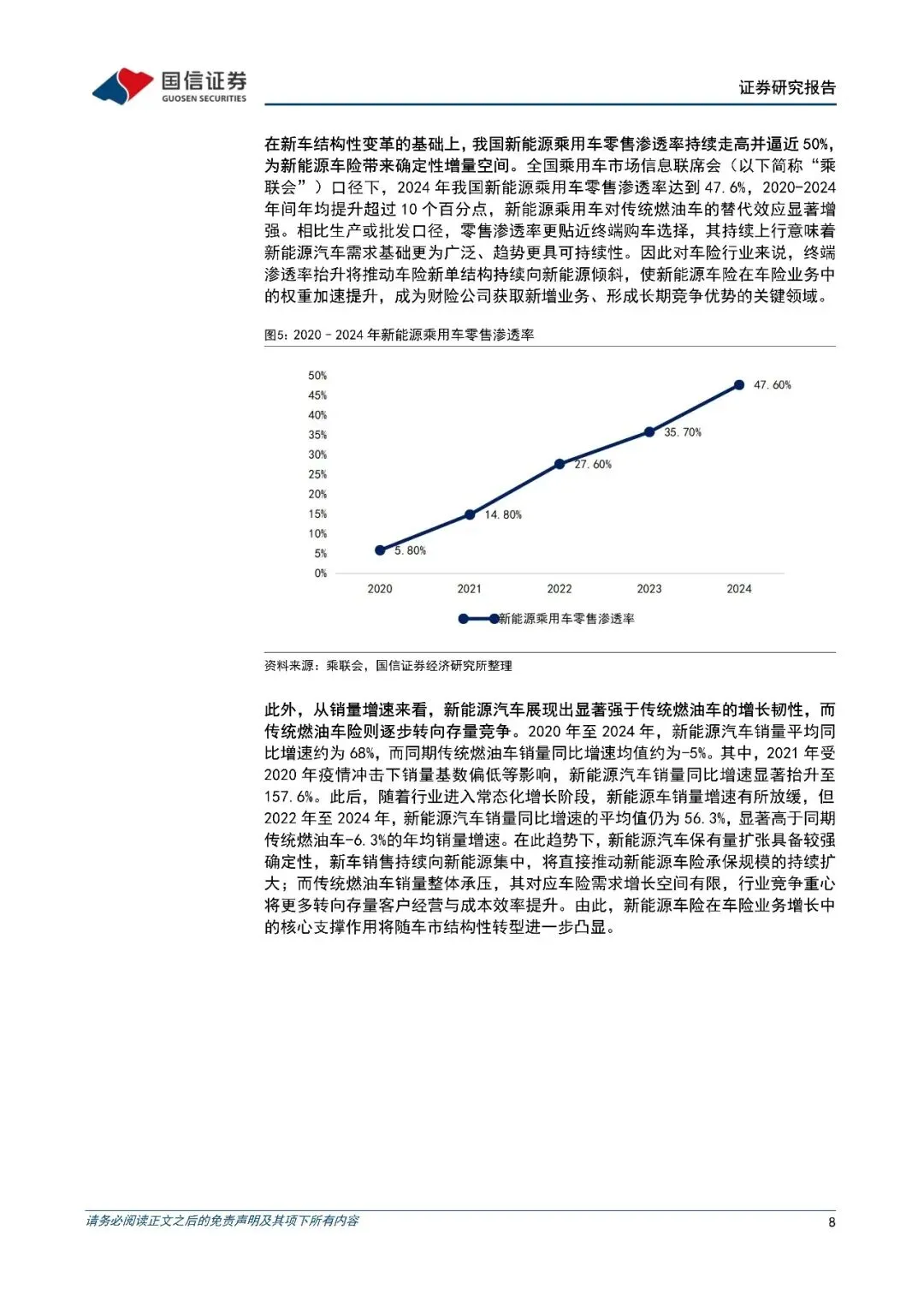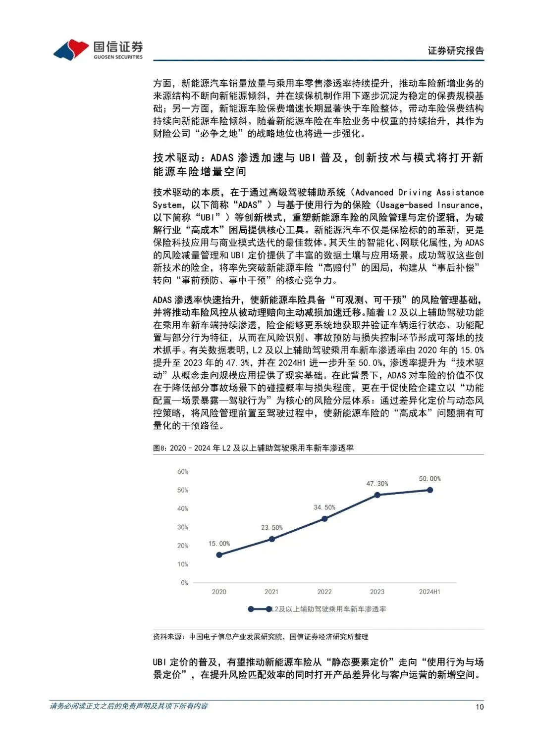产业周期看财险:我国新能源车险已步入"量价齐升"的黄金发展期。在"双碳"目标的国家战略指引与延续性的购置税减免等政策激励下,我国新能源汽车市场渗透率持续快速提升。2024年,我国新能源汽车销量占总新车销量的比例已高达40.9%,零售渗透率逼近50%,其销量增速显著超越传统燃油车,这为车险保费增长提供了坚实的原生动力。与此同时,"高级驾驶辅助系统(ADAS)"渗透率超过50%以及"基于使用行为的保险(1UBI)"等创新模式的普及,正从技术层面重塑车险的风险管理与定价逻辑,为行业破解成本困局提供了关键工具。