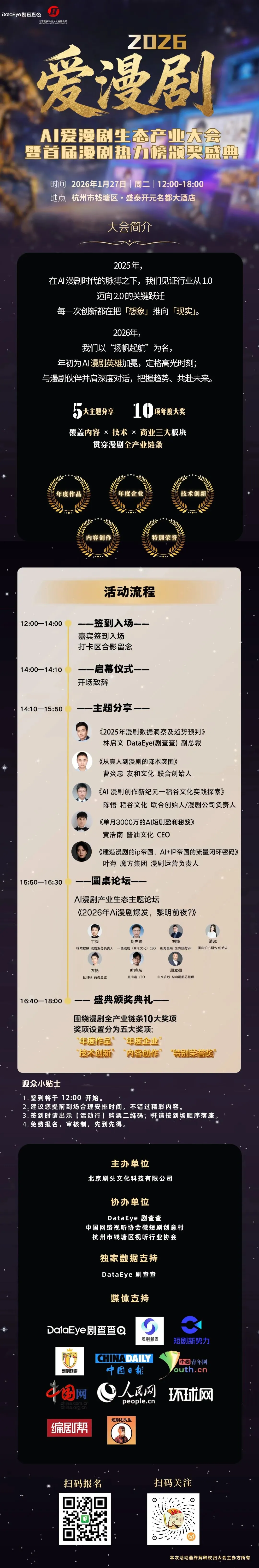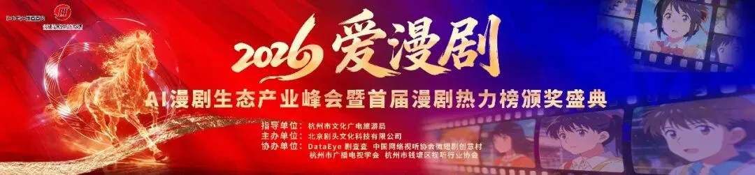 2025年国内漫剧产业预计产值将达200亿,2026年则预计达到350亿以上!当AI漫剧从1.0迈入2.0时代,行业的下一个增长点在哪里?由杭州市文化广电旅游局指导,北京剧头文化科技有限公司主办,DataEye 剧查查、中国网络视听协会微短剧创意村、杭州市广播电视学会、杭州市钱塘区视听行业协会协办的“AI漫剧生态产业峰会暨首届漫剧热力榜颁奖盛典”将于1月27日在杭州市钱塘区举办!活动将邀请友和文化联合创始人 曹炎忠、稻谷文化联合创始人/漫剧公司负责人 陈悟、酱油文化CEO 黄浩南、魔方集团漫剧运营负责人 叶萍以及DataEye副总裁 林启文5位行业大佬进行主题分享,从爆款打造逻辑到商业化变现门道,一站式输出可落地的实战经验。同时以“AI漫剧产业生态”为主题的圆桌论坛也将带你解锁漫剧爆发前夜的流量密码。此外,活动由DataEye 剧查查提供独家数据支持,将以热力榜为依据,覆盖内容、技术、商业三大板块,颁布年度作品、年度企业、技术创新、内容创作、特别荣誉奖五项年度大奖,定格行业高光时刻。现场集结2025年度最强案例与头部玩家,直击2026年行业核心问题,围绕精品化落地、商业化破局、出海避坑等关键议题,带来前沿趋势研判与实操路径拆解。立即点击下图,扫码报名,先到先得!