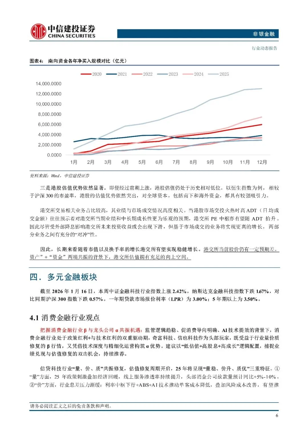 证券:对证券公司而言,衍生品交易监管办法征求意见稿意味着衍生品业务模式将由"通道+自营"向"资本+风控"双重约束转变。保险:负债端看好分红险持续承接居民稳健投资需求并驱动新单实现快速增长,资产端权益市场向好有望带来业绩弹性。香港市场及港交所观点:美联储降息背景下,港股市场流动性宽松,关注非银板块向上弹性。多元金融观点:消费金融行业处于政策红利+技术红利的驱动期。