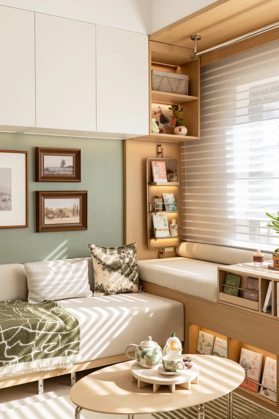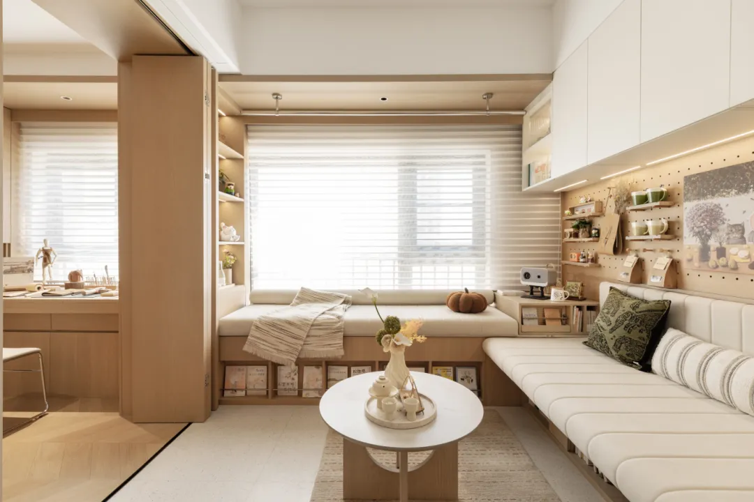 有容有序收纳系统:通过入户收纳、立面收纳、复合功能收纳的系统整合,上翻式储物床、折叠餐桌、沙发卡座收纳系统等设计,大幅提升空间储物能力。