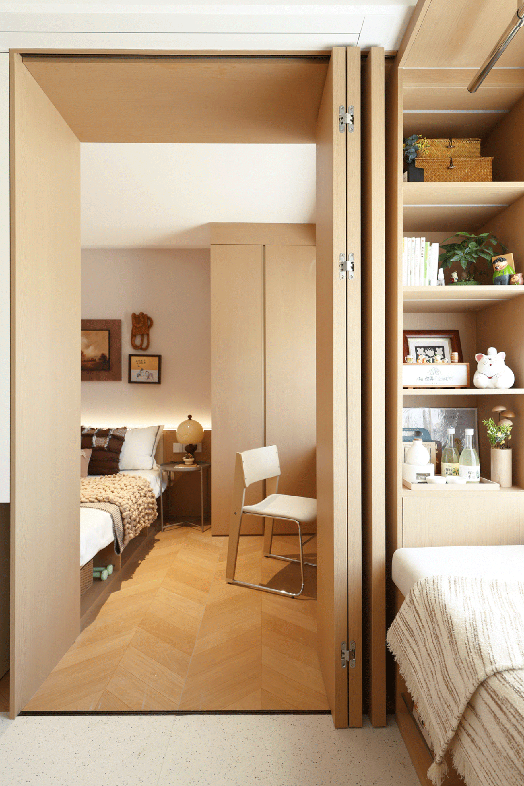 静谧型样本:在卧区创意设计飘窗阅读区,床下嵌入收纳抽屉,墙面一体化柜体消化视觉杂乱。定制电视机内嵌式隔断实现功能分区,同时满足不同时段使用需求。