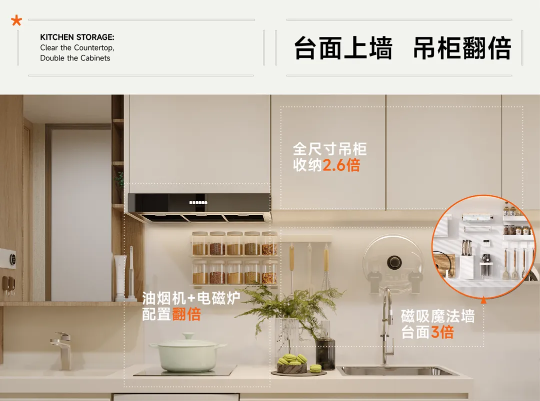 立体倍增厨房空间:通过操作台、储物柜、电器位的垂直整合,实现备餐、轻烹饪与收纳的完整闭环,满足青年租住中高频、轻量但真实的烹饪需求。