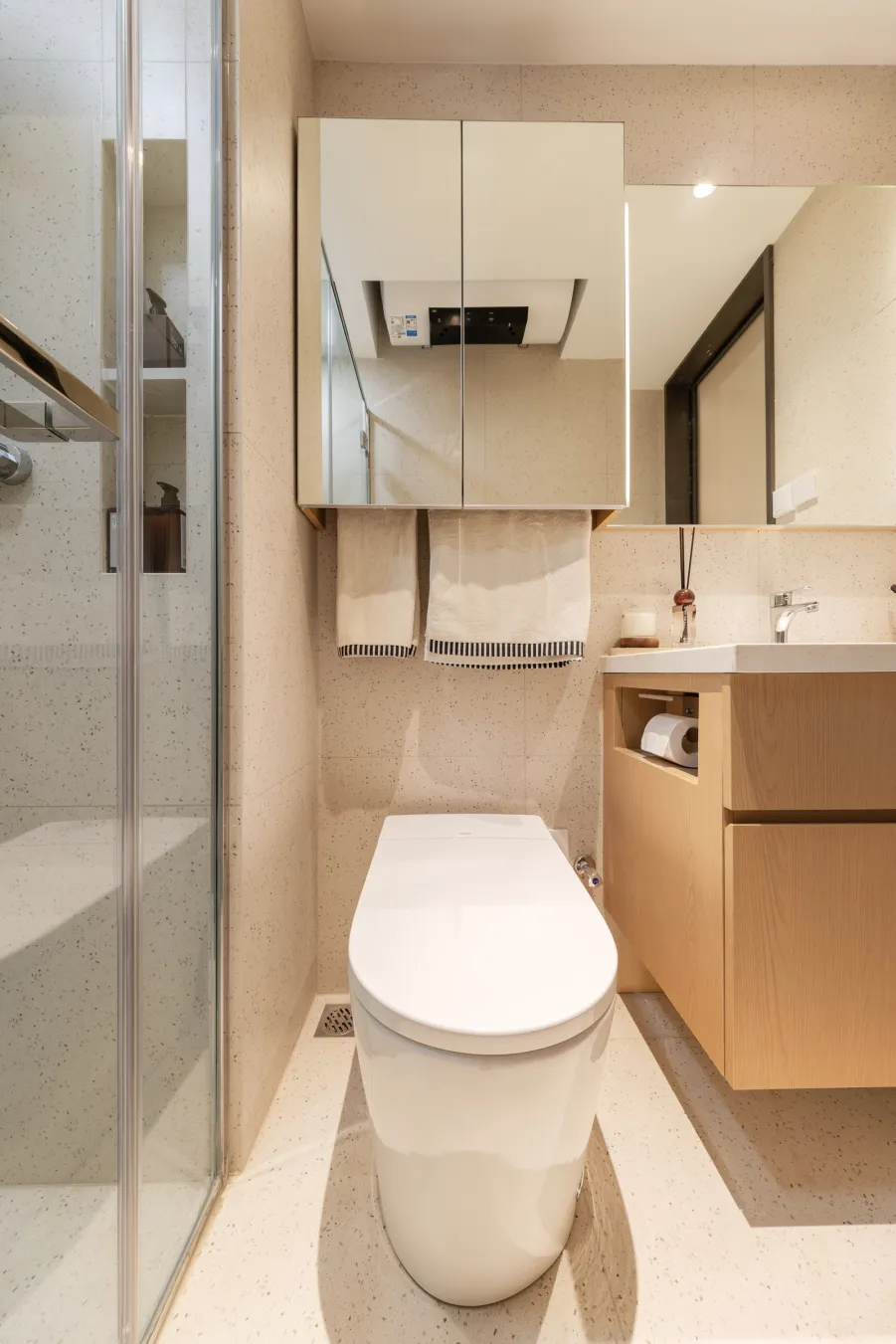 四有两不卫生间:在有限面积中实现独立洗漱台盆、独立淋浴区、不碰腿马桶空间和精细收纳浴室柜系统,同时坚持"面积不盲目做大"和"使用不易磕碰"原则。