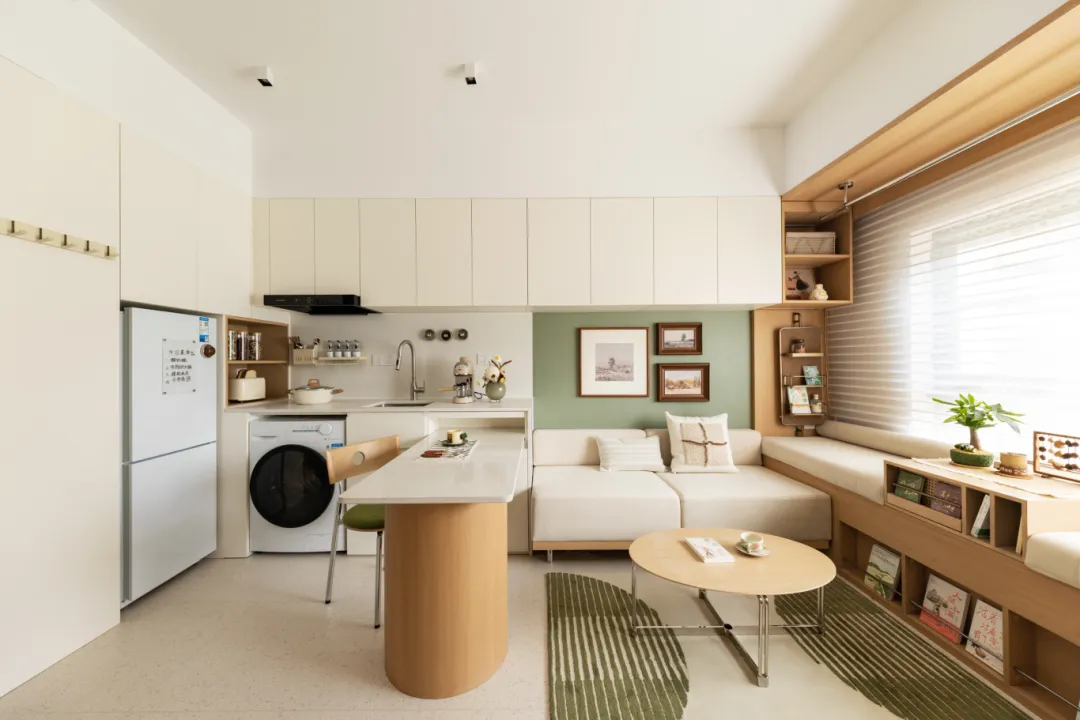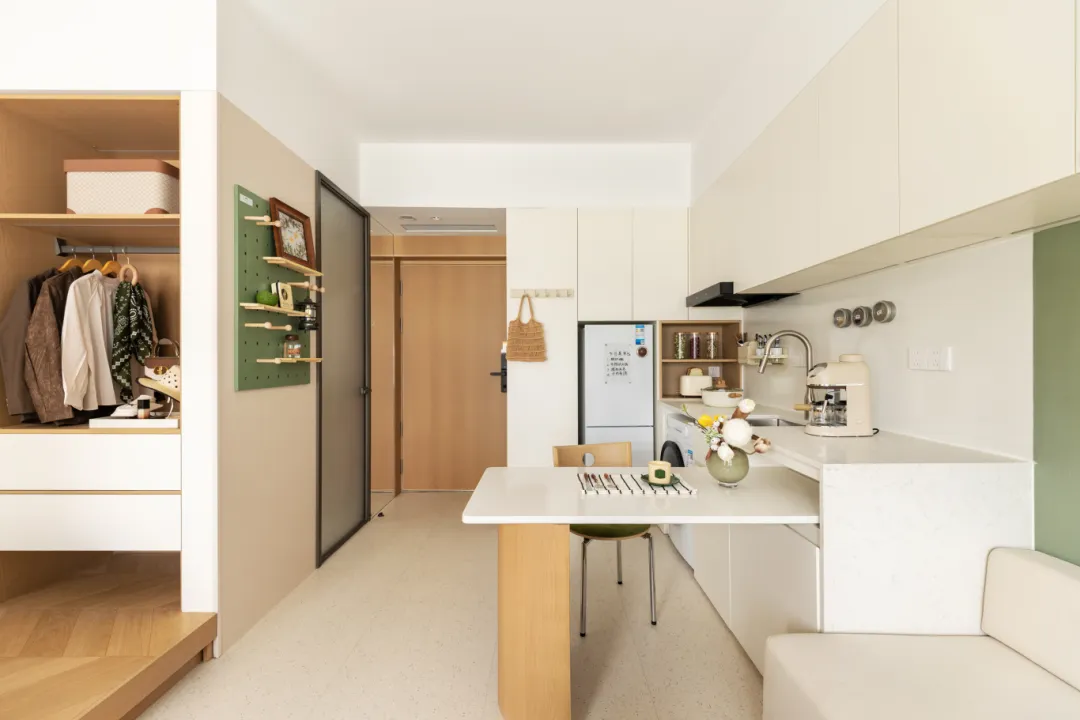 创新性的"功能带"设计将玄关、厨房、卫浴形成连续动线,减少交通空间浪费。洗区前置实现进门清洁功能,同时完成卫浴干湿分区。这种设计让18㎡不再是"凑合生活"的代名词,而成为可以松弛呼吸、有效运转的生活单元。