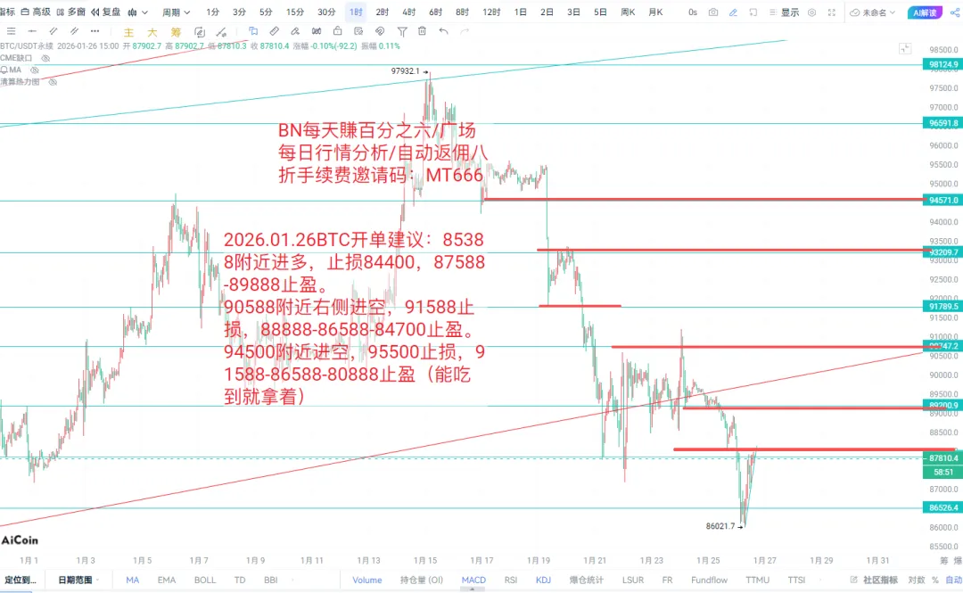 现在是1月26日下午15点06分,BTC昨晚按照昨日下午的行情分析中所讲的,剥夺完96388下方流动性后开始反弹,反弹高点为昨日低点88000附近继续反弹震荡,这里剥夺86388流动性符合昨日的观点,但是反弹没有达到预期,并且86000下方已经开始重新汇聚新的流动性。长线来说,今日早八点日线收盘价是87300,日线MACD快线已回零轴以下,慢线接近零轴,有继续下跌的风险,但是最近几日的多空人数比一直在攀升,今日在2.7-3.0附近徘徊,这也是我所担心的,前几日多次讲到这个多空人数比,按照以往的惯例,多空人数比到达这个位置的时候,基本上就是一个阶段性的底部,结合最近行情一直在清理流动性的思路以及各种消息面层出不穷,我最担心的是BTC会重新掠夺下方流动性后,报复性反弹至本月高点98000附近,掠夺98000-99000附近的流动性后再下跌(当然这里的空单已经挂上几天了,等吧),这也是我前几天BTC价格在89000附近买了几张本月底以及下月初的看涨期权的原因。短期来看,这里还会继续震荡,长期行情需要重新试探一个新的大周期底部价格然后再上涨。最近行情比较难做,昨日说到的86588的激进多单进场位置在今天醒来反弹至87900回落87100附近被吓跑了,果然人在赤裸状态下的胆子会变小。刚刚又在昨日的低点87850附近做了一个试探性空单,88188止损,几百点小止损,避免下跌行情的踏空,挨打就等价格上去再空吧。上下方的压力支撑观点与昨日相同,做单思路上重新添加了前几日90588附近做空的位置,不过这次是右侧进场,上次90888止损价格打到91200附近继续下跌真的太冤了,行情太狗,稳健为主吧。