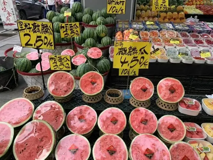5月14日,乔司西瓜零售价格降至2.8元-3.5元一斤,江苏盐城麒麟瓜降至3.25元一斤,早春红玉降至2元左右一斤。半个多月时间,杭州市场西瓜售价平均跌幅约50%。