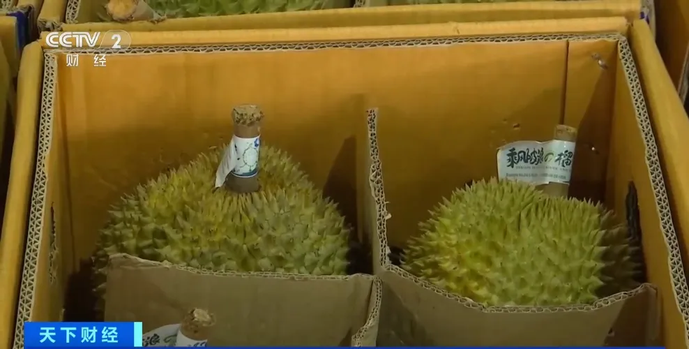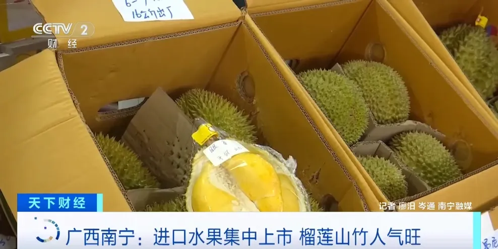 在广西海吉星农产品国际物流中心,记者看到,每个榴莲货柜前面,挤满了前来进货的商贩,交易十分火爆。目前,市场上销售的榴莲主要来自泰国。其中,金枕榴莲因产量丰富、核小肉甜,最受消费者欢迎。