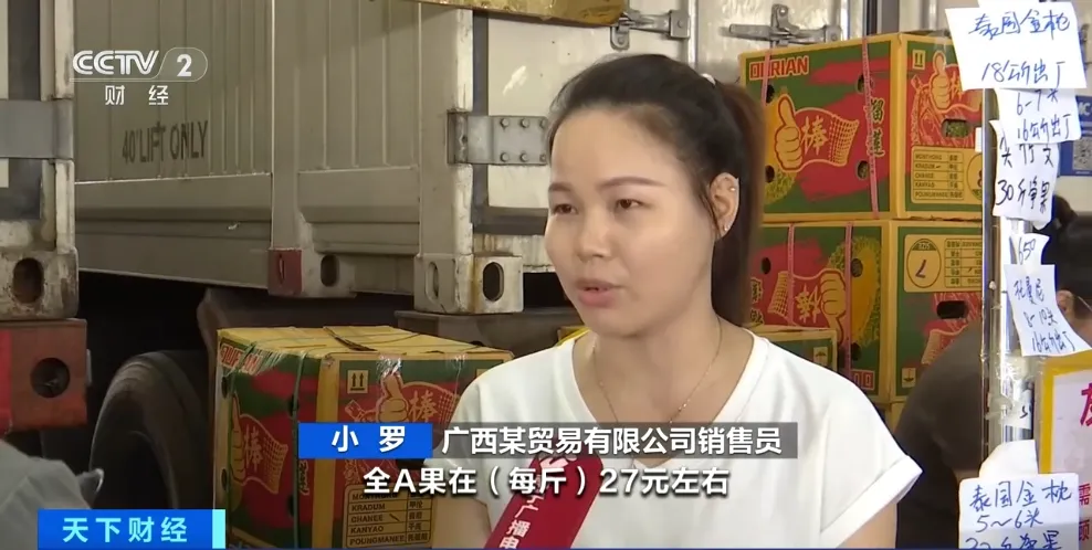 广西某贸易有限公司销售员 小罗:目前金枕榴莲的单价,全A果在(每斤)27元左右,有一些稍微次一点,批发价就大概在20元到22元(每斤)。