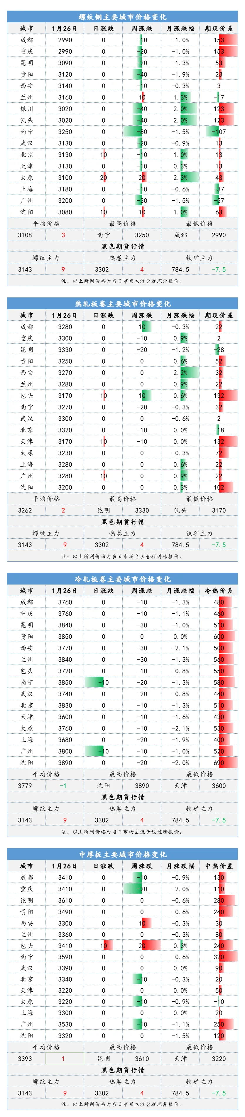 今日黑色期货冲高受阻,钢材现货成交整体偏弱,价格基本持稳或小幅上涨,下游按需采购为主。