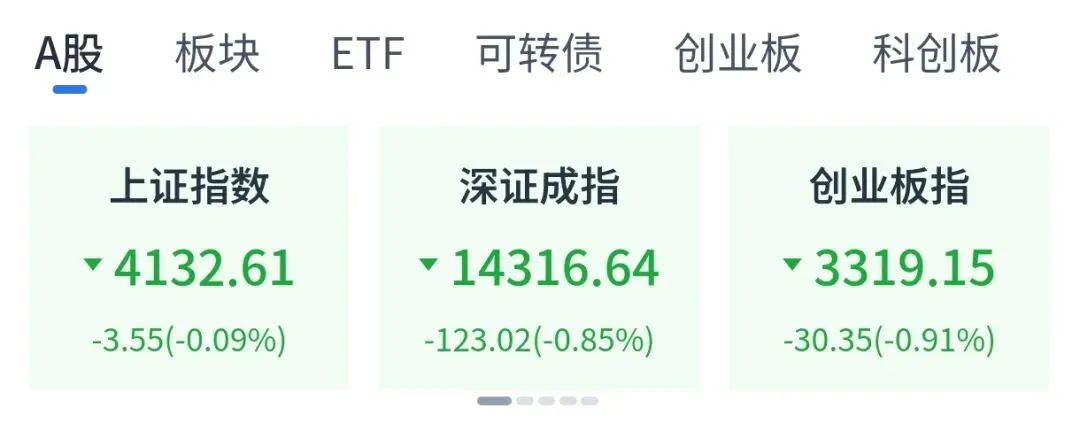 跌0.09%;科创50指数跌1.35%;深证成指跌0.85%;创业板指跌0.91%,