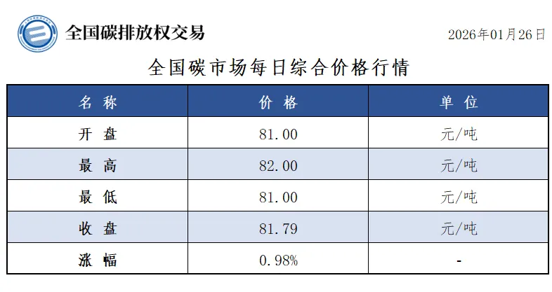 今日全国碳市场综合价格行情为: 开盘价81.00元/吨,最高价82.00元/吨,最低价81.00元/吨,收盘价81.79元/吨,收盘价较前一日上涨0.98%。