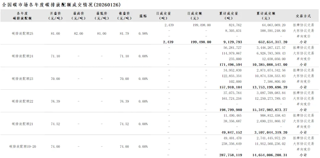 2026年1月1日至1月26日,全国碳市场碳排放配额成交量10,075,302吨,成交额727,357,729.80元。