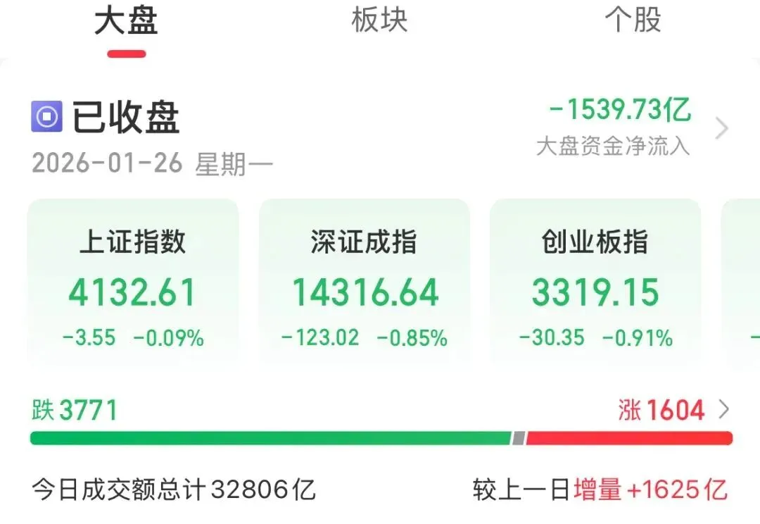 1月26日早盘,A股三大指数突然由涨转跌,集体翻绿,创业板指跌近1%。A股三大指数集体调整。其中,沪指跌0.09%,深成指跌0.85%,创业板指跌0.91%,北证50指数跌1.45%。沪深京三市成交32806亿元,较上一日增量1625亿元,三市超3700只个股飘绿。在板块题材上,黄金、有色金属、油气开采及服务等板块涨幅居前。日内电网设备、特高压、智能电网板块继续保持强势,消息面上,国家电网官网文章提到,“十五五”期间,国家电网公司固定资产投资预计达到4万亿元,较“十四五”投资增长40%。“表面看是政策驱动的估值修复,实则是全球能源基建与AI需求共振的必然结果。”中国企业联合会特约研究员胡麒牧对《证券日报》记者表示,中国企业在特高压、柔性直流、智能配网等领域的技术积累,恰好契合了全球电网数字化、低碳化、高可靠性的三大趋势。