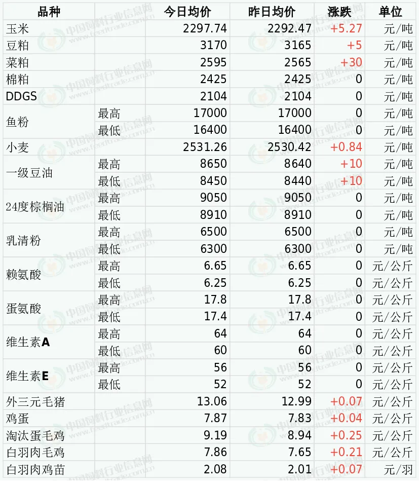 26日DDGS价格平稳。近期原粮玉米价格处于高位,酒精企业生产压力较大,仍支撑企业挺价心态,饲企提货积极性尚可,但需求量增加并不明显,饲企多消化库存,采购积极性较为一般。综合多方因素影响,我们预判1月份上半月期间大多数时候DDGS交易价格总体稳中略显偏弱下半月稳中略新偏强走势为主的可能性更大,月度均价环比继续下跌的几率在逐步提高。受周度出口销售数据表现强劲的提振,CBOT大豆期货收盘上涨,基准期约收高0.4%。不过近期巴西产区天气较好大豆收割工作稳步推进,大豆出口能力将快速提升限制美盘大豆市场回升空间。国内节前饲料养殖企业备货需求启动,油厂大豆压榨产生的豆粕数量不及拿货需求量后工厂库存连续下滑,支撑油厂对豆粕的挺价意愿。不过后期进口美国大豆将陆续到港,叠加国储进口大豆拍卖持续,春节后国内进口大豆供给将保持宽松,市场对供应减少的担忧心态减弱,豆粕市场将维持窄幅波动行情。今日棉粕市场价格总体稳定。油厂周度大豆压榨量升至200万吨之上,豆粕产出增加,节前备货需求陆续启动,油厂挺粕动力依然偏强,但供应依旧限制涨幅空间。近来棉籽价格走势偏强,对成本有一定支撑作用,同时棉粕供应压力下降后利多行情。短期棉粕依旧震荡调整走势。今日郑州菜粕期货低开后震荡上涨。加拿大油菜籽期货进一步上涨,基准期约收高1.9%,因为中加达成协议后,中国开始恢复采购加拿大油菜籽,芝加哥豆油期货飙升,国际原油走强,加拿大农业部的供需数据整体偏好。菜粕现货小幅上涨,因为货少,为菜粕提供支撑。预期3月以后菜系供应增加,市场关注菜籽菜粕买船情况。外盘方面,部分厂商不主动报价,购销僵持,其中秘鲁新季超级蒸汽鱼粉预售参考价格为CNF2100美元/吨。捕鱼方面,截止到20日,配额完成96.38%。国内进口鱼粉库存仍下降,且新季鱼粉到货量少,持货商观望,价格波动不大。当前秘鲁超级蒸汽鱼粉价格集中在16400-17000元。短期持货商心态保持观望。今日小麦市场价格平稳为主运行。小麦价格整体保持稳定,仅个别区域出现窄幅调整。当前小麦市场政策调控与市场需求之间形成动态平衡。在供应有序增加、持粮心态平稳、需求温和释放的格局下,预计小麦价格仍将维持区间内窄幅震荡,部供应偏紧区域仍有温和上涨空间。上周五CBOT豆油市场震荡回升,保持强势。上周五马来西亚棕榈油市场反弹遇阻震荡收低,受到获利了结以及马币走强的影响。马来西亚棕榈油供需基本面改善,国内棕榈油卖压缓解。近期国内棕榈油买船活跃,成本驱动国内棕榈油价格重心回升。美国生柴政策备受关注,国内豆油库存下降,需求旺季效应叠加技术买盘,豆油市场保持反弹节奏。整体来看,油脂基本面改善,中东局势趋紧提振原油上涨,国内油脂板块有望保持震荡偏强状态。中美贸易冲突缓和,互相取消额外的商船岗务费,国内港口乳清粉到货量趋于好转,大猪仔猪价格低迷,乳清粉市场报价稳中偏弱整理,后续需注意关税谈判进展以及港口库存量等因素。2025年11月,我国赖氨酸与赖氨酸盐及酯的出口量为9万吨,同比降4%,环比增5.8%。11月万里润达氨基酸生产线计划阶段性升级检修。1月15日市场称金玉锋98.5%赖氨酸报价6.25元/公斤,70%赖氨酸报价4.1元/公斤 。近日部分赖氨酸厂家报价上调50-100元/吨,市场稳中偏强。2025年11月国内蛋氨酸进口量为1.25万吨,同比降30%,环比降19%.赢创宣称计划第三、四季度分别对其新加坡工厂和安特卫普工厂进行为期6-7周的技术升级。市场称希杰马来西亚蛋氨酸工厂12月至2026年1月初检修,12月26日市场称新和成固蛋工厂部分生产线计划1月中下旬开始停产检修2-3周。12月31日市场称新和成固蛋提价至18.5元/公斤。欧洲VA1000市场报价15-16欧元/公斤。2025年3月万华化学VA产业链投产。6月12日巴斯夫VA解除不可抗力影响。10月28日市场称部分厂家报价提至70-72元/公斤。2026年1月6日市场称新和成VA提价至70元/公斤。2026年1月15日市场称浙江医药VA提价至75元/公斤。欧洲VE市场报价5.5-5.8欧元/公斤。11月3日市场称益曼特计划自11月初检修至12月底。12月市场称部分厂家VE产品提价至65-68元/公斤,12月30日市场称浙江医药VE产品停报。1月13日市场称浙江医药VE产品提价至72元/公斤, 市场稳中偏强运行。全国均价为 13.06元/公斤,较上周五价格上涨0.54%。北方节前集中出栏致供应激增、价格下探,南方靠春节备货支撑稳中有涨。短期行情震荡为主,1 月下旬或小幅反弹。今日鸡蛋价格稳中有涨。尽管近期在产蛋鸡存栏呈下降趋势,但存栏整体仍处于相对高位,供给压力持续释放,难以支撑蛋价大幅上行。同时,春节备货带来的价格提振效应逐渐减弱,未来蛋价上涨空间较为有限。预计近期鸡蛋价格或震荡运行为主,上下波动空间有限。今日主产区山东鸡蛋均价7.91元/公斤,与昨日价格持平;河北鸡蛋均价7.27元/公斤,较昨日价格下跌0.02;广东鸡蛋均价8.27元/公斤,与昨日价格持平;北京鸡蛋均价7.84元/公斤,与昨日价格持平。全国淘汰蛋毛鸡均价上涨。因蛋价盈利导致养殖户惜淘、淘汰量偏少,而节前屠宰端备货补库需求旺盛,共同支撑行情偏强;预计节前整体呈震荡偏强,但高存栏限制涨幅。今日山东地区淘汰蛋毛鸡均价9.51元/公斤,较昨日价格上涨0.29;江苏地区淘汰蛋毛鸡均价9.58元/公斤,与昨日价格持平;辽宁地区淘汰蛋毛鸡均价9.60元/公
