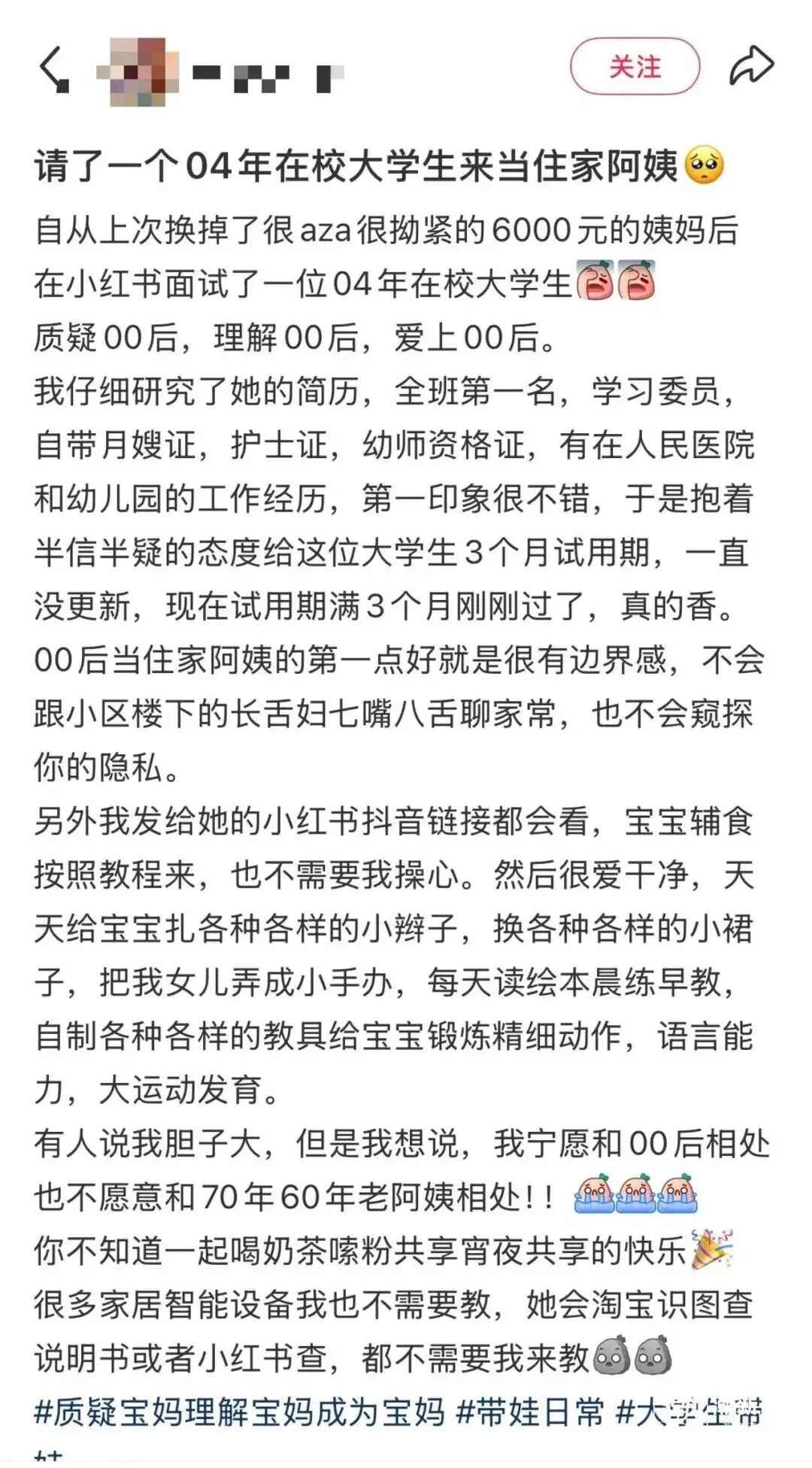 在社交平台上,有女网友分享了雇佣一名2004年出生的在校大学生来当住家阿姨的经历。“质疑00后,理解00后,爱上00后。”这位网友列举了年轻阿姨的优点:边界感清晰、学习和适应能力强、沟通效率高。