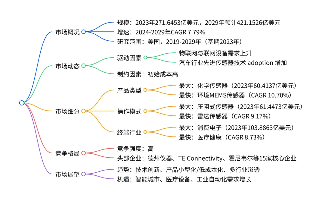 2023 年美国传感器市场规模达271.6453亿美元,预计2024-2029年以7.79% 的CAGR增长,2029 年将达421.1526亿美元;市场增长主要受物联网与联网设备需求上升、汽车行业先进传感器技术 adoption 增加驱动,同时面临初始成本高的制约;产品类型上,化学传感器为 2023 年最大细分市场(占比 22.24%),环境 MEMS 传感器增长最快(CAGR 10.70%);操作模式中,压阻式传感器占比最高(22.62%),雷达传感器增速领先(CAGR 9.17%);终端行业里,消费电子占比最大(38.24%),医疗健康增长最快(CAGR 8.73%),市场竞争激烈,头部企业包括德州仪器、TE Connectivity 等。