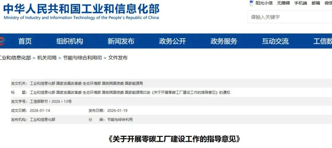 1月19日,工业和信息化部、国家发展改革委、生态环境部、国务院国资委、国家能源局等五部门发布《关于开展零碳工厂建设工作的指导意见》(工信部联节〔2026〕13号,以下简称《指导意见》),深挖工业和信息化领域节能降碳潜力,带动重点行业领域减碳增效和绿色低碳转型,培育发展新质生产力。