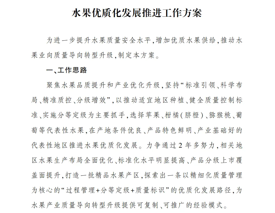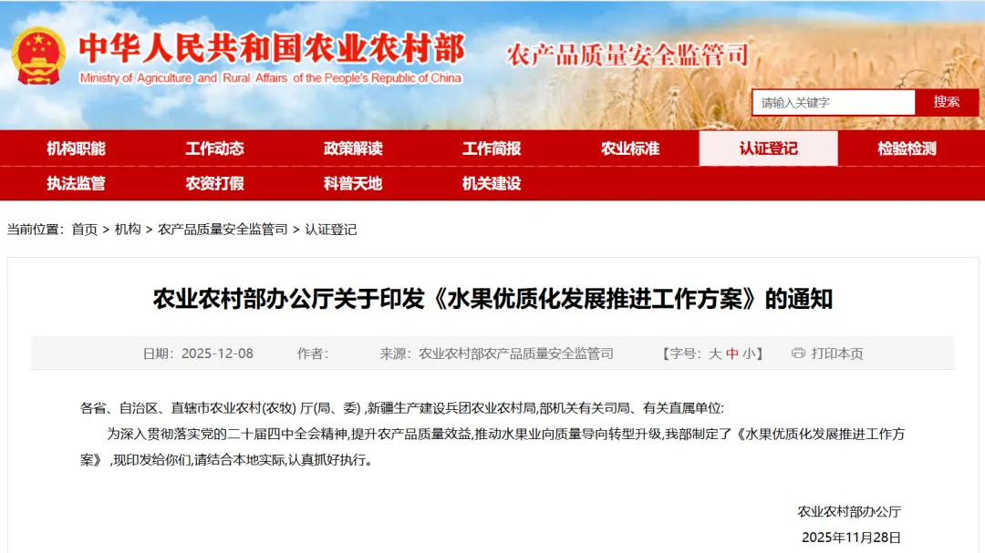 2025年11月,农业农村部发布《水果优质化发展推进工作方案》,一纸政策为我国水果行业按下了 “品质升级” 的加速键。