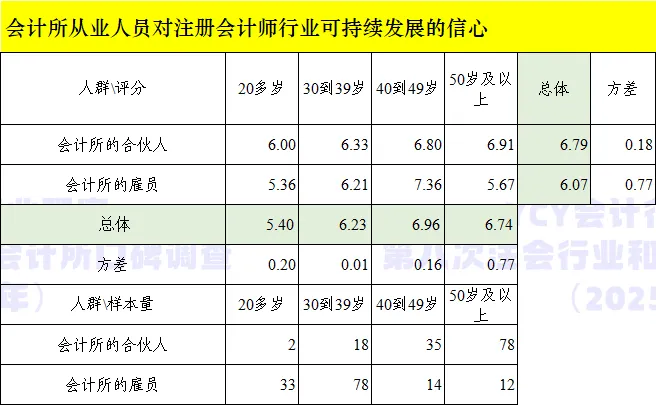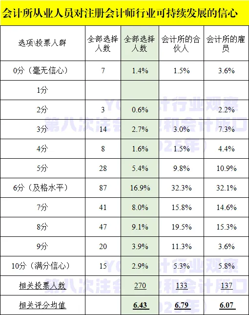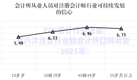 在2025年的YCY口碑调查中,270位会计所从业人员的综合信心打分为6.43分。其中133位会计所合伙人对注册会计师行业可持续发展的信心是6.79分,高于6分及格分,也高于137位会计所雇员的评分6.07分。