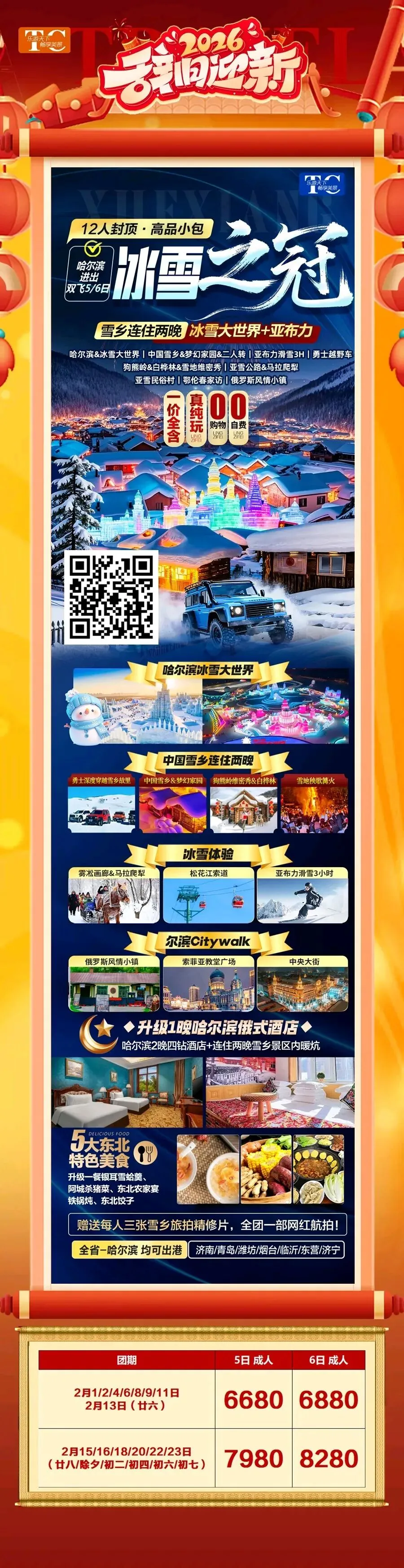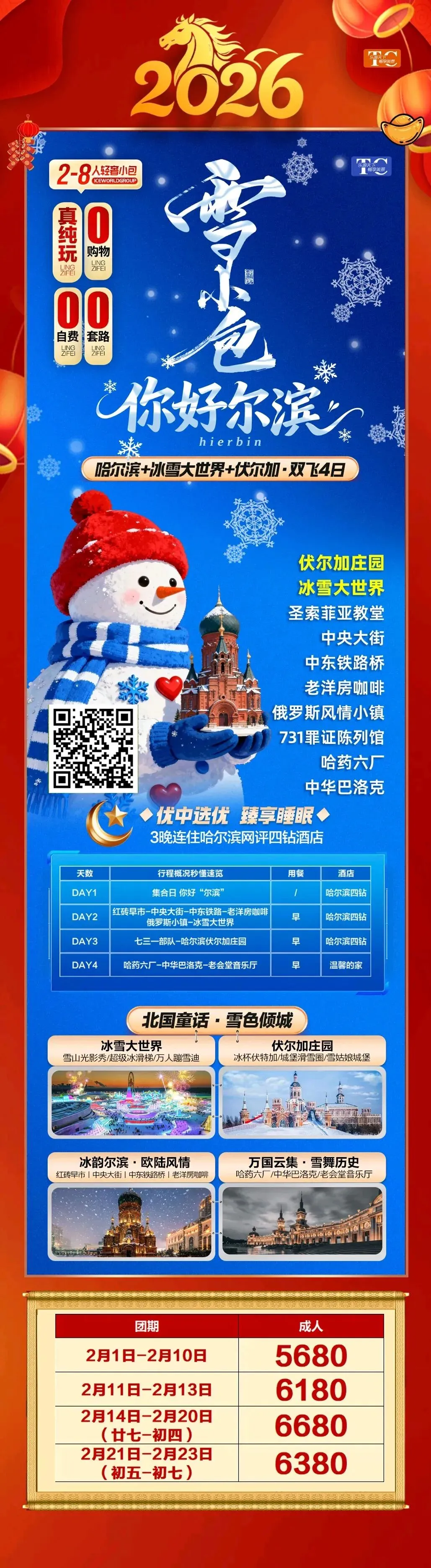 【冰雪童话】哈尔滨/横道河子/亚布力/镜泊湖/雪乡/冰雪大世界双飞5/6日2-8人轻奢小包|真纯玩 0购物|全程无自费无套路!🏰 伏尔加庄园:冰杯伏特加 + 城堡滑雪圈 + 雪姑娘城堡秘境打卡🌆 漫游冰韵哈尔滨:中央大街+圣索菲亚教堂+俄罗斯风情小镇+老洋房咖啡~🧊长春/大美长白山/小韩国延吉/中国雪乡/冰雪迪士尼/激情滑雪/雾凇长廊/小火车🔴赠送:马拉爬犁丨冰雪画廊丨雪地摩托丨雾凇漂流丨梦幻家园&二人转【重大须知】请务必详细阅览!