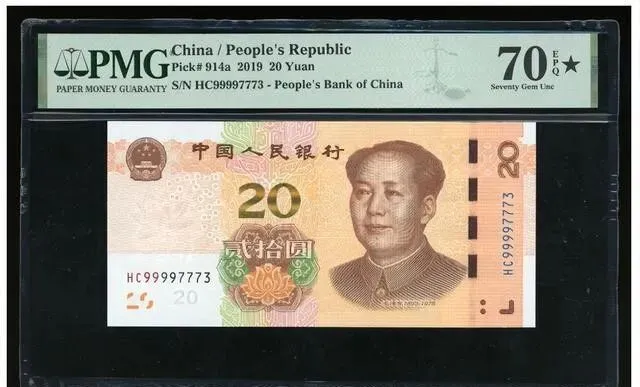 PMG评级70分 , 这是最高等级 , 还带黑星标志 , 品相完美到什么程度呢?相当于银行刚拆封的整捆里 , 直接抽出来密封保存的那种。