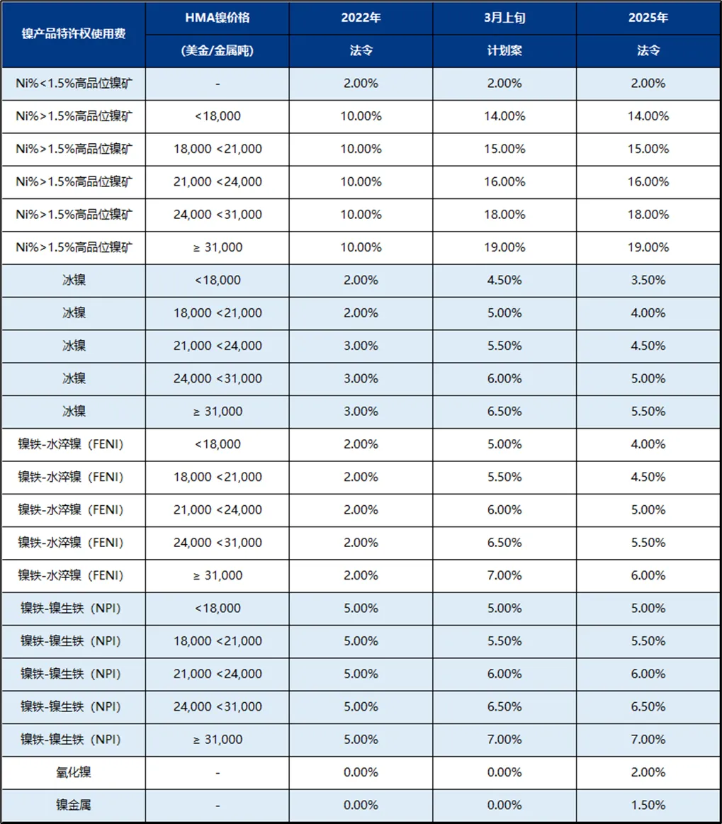 2025年4月印尼政府上调了印尼矿产特许权使用费,新法案普遍上调了镍产品的税费,取消了镍锍的暴利税,同时新增了镍金属的1.5%的税费,尽管法案执行对象仍是持有采矿许可证的运营人,当LME镍价在1.8万美元以下,镍金属吨成本增加180-300美元/吨,而当LME镍价在1.8万美元上,镍金属吨成本将大约再增加100美元左右。