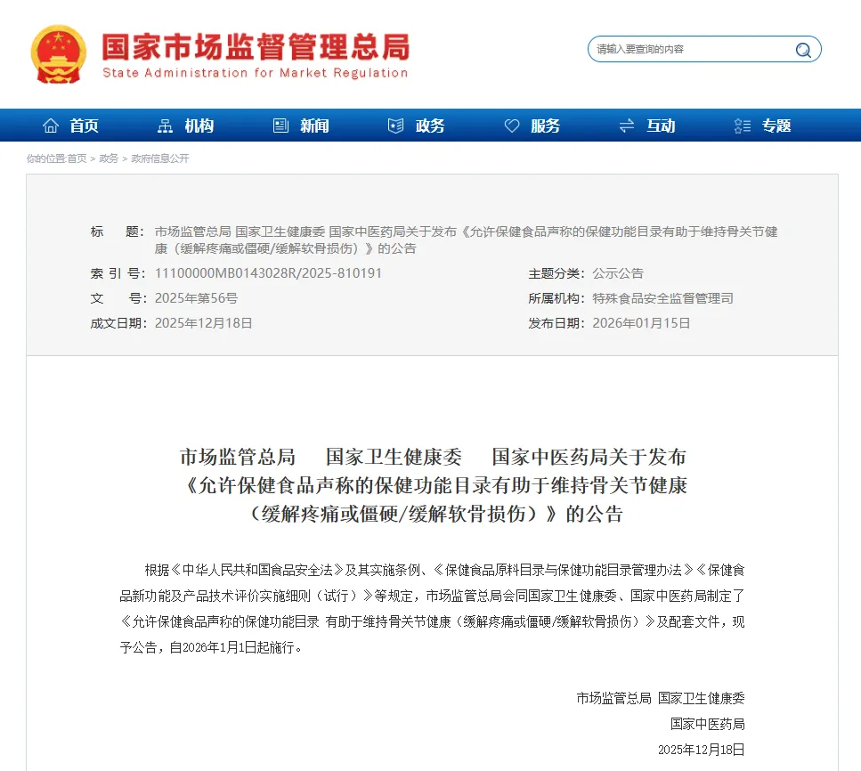 行业资讯 | 多部门联合发文,“有助于维持骨关节健康”纳入保健功能目录