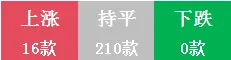 今天上涨有16款,下跌0款,与昨日行情相比总体上涨。