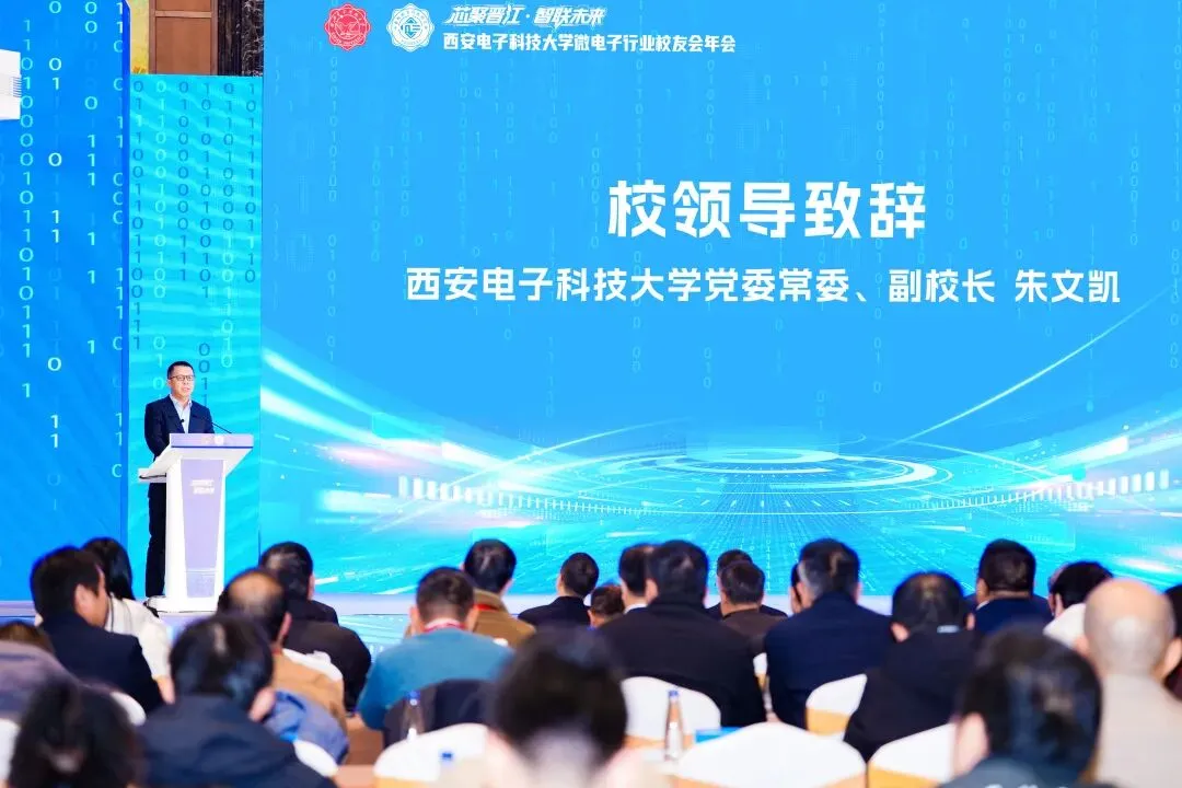 朱文凯在致辞中介绍了西安电子科技大学建设发展情况。他高度肯定了微电子行业校友会在团结校友、服务行业、回馈母校方面取得的扎实成效,勉励广大校友继续弘扬“西电精神”,促进校地校企合作交流,在集成电路行业一线奋发作为,为国家科技自立自强贡献智慧与力量。